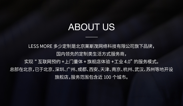LESS MORE多少定制 2015年5月創(chuàng)立于北京,以互聯(lián)網(wǎng)思維和工業(yè)4.0切入服裝定制領(lǐng)域,獨(dú)創(chuàng)“互聯(lián)網(wǎng)預(yù)約+旗艦店體驗(yàn)+免費(fèi)上門量體+工業(yè)4.0 C2M生產(chǎn)”的模式,現(xiàn)已成為國內(nèi)服裝定制行業(yè)的標(biāo)桿品牌。